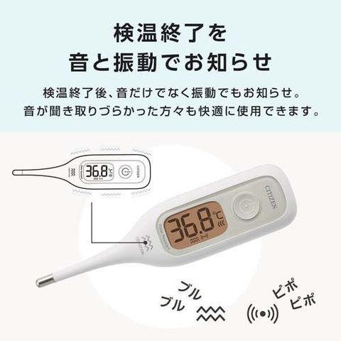 ●振動と音でお知らせ:音だけでなく振動でも検温終了をお知らせ。音の聞き取りづらい方でも振動で検温の終了をわかりやすくしました。<br>●予測式約30秒+実測式:約30秒で予測検温が完了します。ピポピポ(ブザー音)かブルブル(振動)またはその両方の合図で取り出します。そのまま体温計を取り出さずに検温を続けていただくと、約10分で実測検温を表示します。<br>●バックライト搭載:暗いところでの測定でも結果が見やすいバックライト機能を搭載しました。<br>●抗菌・防水仕様:防水仕様(IPX7)と、抗菌樹脂で、清潔にご使用頂けます。<br>(販売名)シチズン 振動式体温計