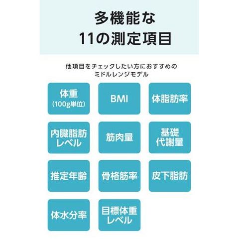 ●多機能な11の測定項目と判定付き<br>・体重(100g単位)<br>・BMI(0.1単位)<br>・体脂肪率(0.1%単位)<br>・筋肉量(0.1kg単位)<br>・基礎代謝量(1kcal単位)<br>・内臓脂肪レベル(1レベル単位)<br>・推定年齢(1才単位)<br>・骨格筋率(0.1%単位)<br>・目標体重設定(1kg単位)<br>・皮下脂肪率(0.1%単位)<br>・体水分率(0.1%単位)<br>※(6~80才)体重、BMI、体脂肪率、筋肉量、基礎代謝、骨格筋率<br>(18~80才)内臓脂肪レベル、推定年齢、皮下脂肪率<br>(20~80才)体水分率<br><br>●乗るだけでユーザー自動認識、オートオン・オフ 4人のユーザー登録が可能で家族みんなで使える<br>本体に乗るだけで電源が入り、測定を開始します。登録したユーザー(4人まで)を自動認識し、各測定項目を算出します。<br>●暗い部屋でも測定結果が見やすいバックライト機能を搭載。立て掛け収納ができ、収納に困りません。フラットなデザインで素足で乗る体組成計のお手入れが簡単です。ペースメーカーなどの体内機器を装着されている方は使用しないでください。<br>●その他特徴<br>・135kgまではかれる強固なガラス<br>・場所を取らない薄さ26mm、立てかけて収納<br>・4ユーザー×前回値メモリー、ゲストモード付き