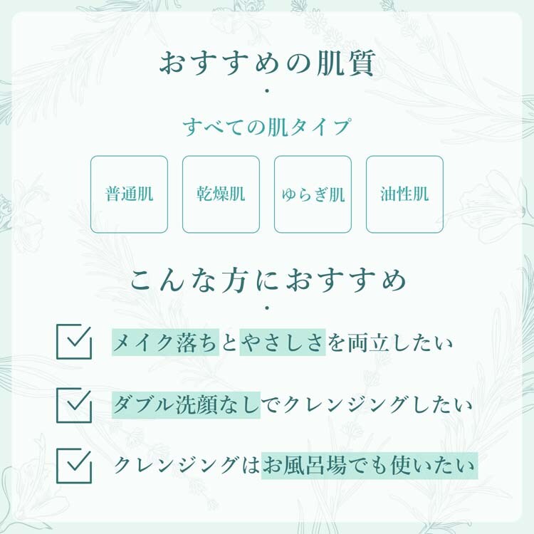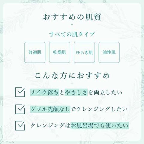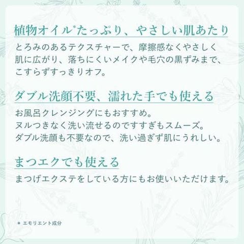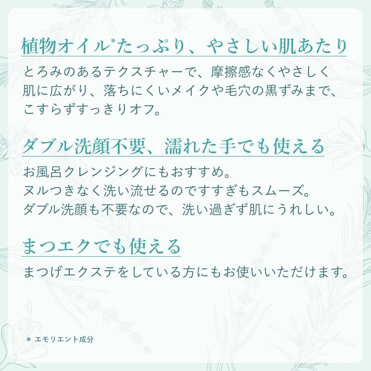 濡れた手でも使えるのでお風呂クレンジングにも!ヌルつきなく素早く洗い流せるのですすぎもスムーズなうえ、ダブル洗顔不要なので、洗い過ぎず肌のうるおいはキープ。まつげエクステをしている方にもお使いいただけます。