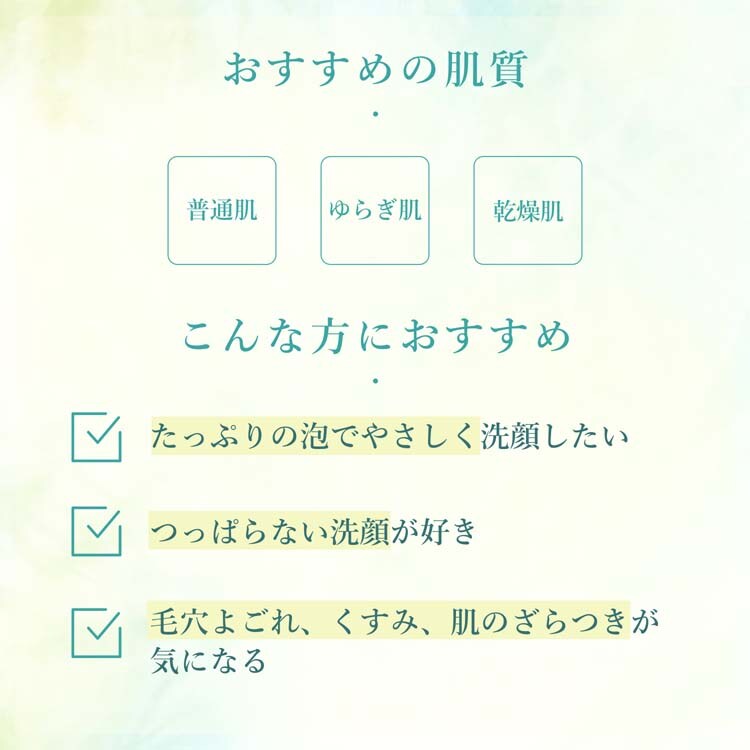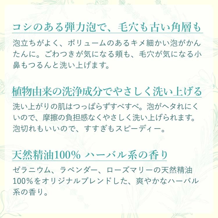 ●植物由来の洗浄成分:植物由来の洗浄成分でやさしく洗い上げ、つっぱらずつるんとなめらかな肌へ。泡がヘタりにくく、摩擦の負担感を抑えて洗えます。