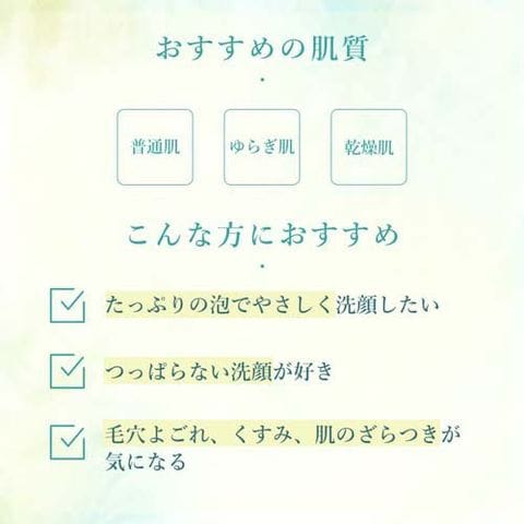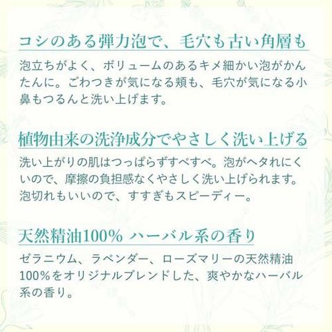 ●コシのある弾力泡:キメ細かくボリュームのある泡が肌を包みこみ、毛穴のよごれや古い角質をきちんと落とし、つるんと洗い上げる洗顔フォーム。