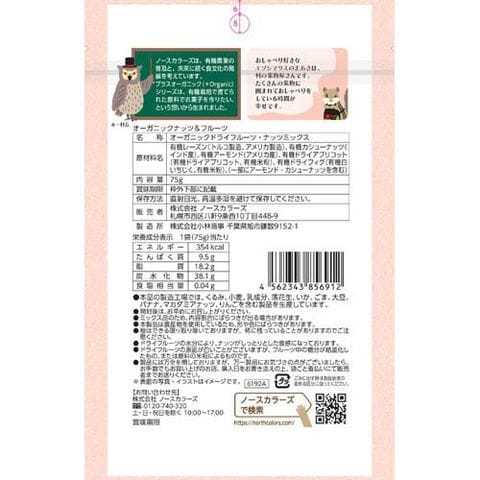 | 有機レーズン(トルコ製造、アメリカ製造)、有機カシューナッツ(インド産)、有機アーモンド(アメリカ産)、有機ドライアプリコット(有機ドライアプリコット、有機米粉)、有機ドライフィグ(有機白いちじく、有機米粉)、(一部にアーモンド・カシューナッツを含む) |