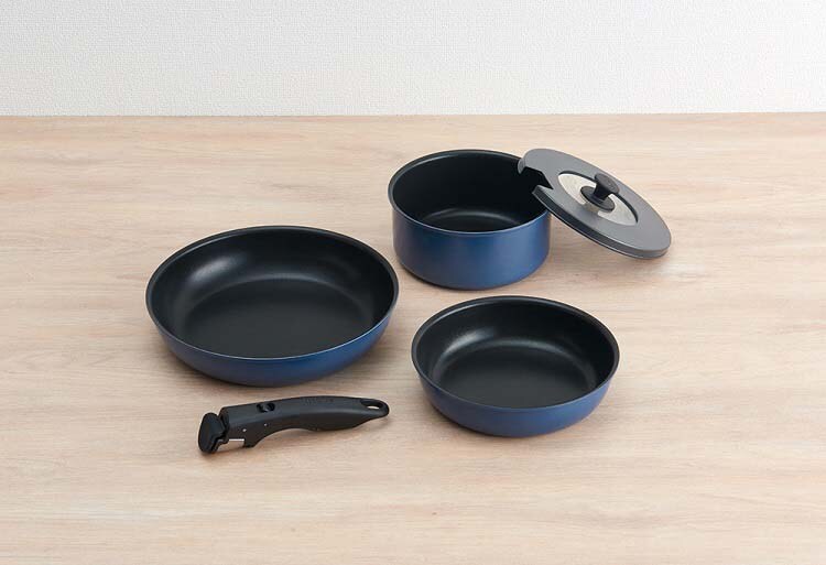 フライパン20cmと26cm、煮込み料理に便利な18cm鍋、取っ手や鍋専用フタが一緒になったベーシックなセット。フライパンは、硬質フィラーを配合した、耐久性コーティング。耐摩耗性の高さと焦げつきにくさが特長です。また、取っ手はワンタッチで取り付け・取り外しOK。
