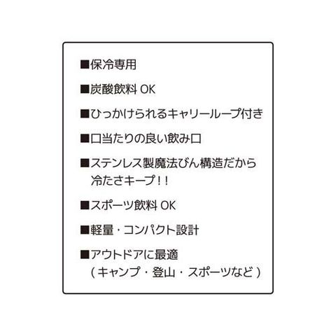 | 本体寸法:約幅7.5×奥行6.5×高さ24.0cm 本体重量:約0.3kg 実容量:0.53L(使用容量:0.5L) 口径:約3.6cm 保冷効力:10度以下(6時間) 材質:内びん:ステンレス鋼 / 胴部:ステンレス鋼(アクリル樹脂塗装)/ フタ・せん本体:ポリプロピレン / フタパッキン・せんパッキン:シリコーンゴム / カタ・ループ:ポリプロピレン・ポリアセタール |