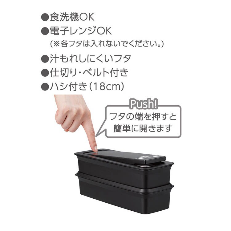 | 本体寸法:約幅21.0×奥行8.0×高さ9.0cm 本体重量:約0.3kg 容量:980ml(490ml×2個) 材質:上フタ・下フタ・本体・仕切り:ポリプロピレン / ハシフタ:ABS樹脂 / パッキン:シリコーンゴム / ハシ:飽和ポリエステル樹脂 |