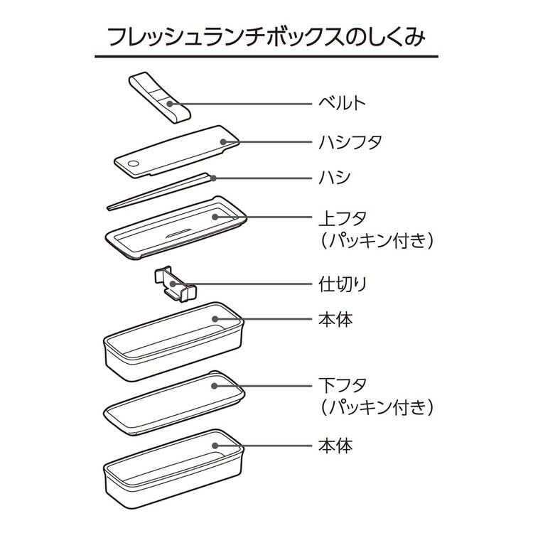 | 本体×2個・仕切り・上フタ(パッキン付)・上フタ(パッキン付)・ハシ・ハシフタ・ベルト |