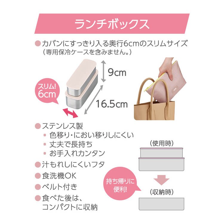 | 本体寸法:約幅16.5×奥行6.0×高さ9.0cm(専用保冷ケースを含みません。) 本体重量:約0.3kg(専用保冷ケースを含みます。) 容量:635ml(上容器:230ml、下容器:405ml) 材質:上容器本体・下容器本体:ステンレス鋼 / 上フタ・下フタ:ポリプロピレン / 上フタパッキン・下フタパッキン:シリコーンゴム /(専用保冷ケース)外生地・内生地:ポリエステル / クッション(断熱材):発泡ポリエチレン |