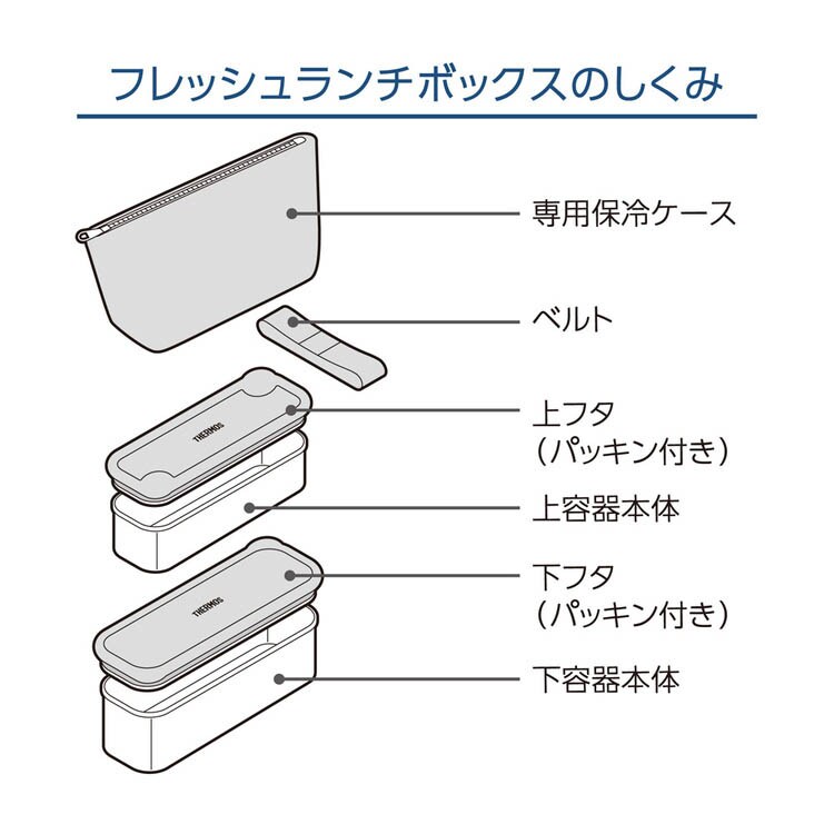 上容器本体・上フタ(パッキン付)・下容器本体・下フタ(パッキン付)・ベルト・専用保冷ケース