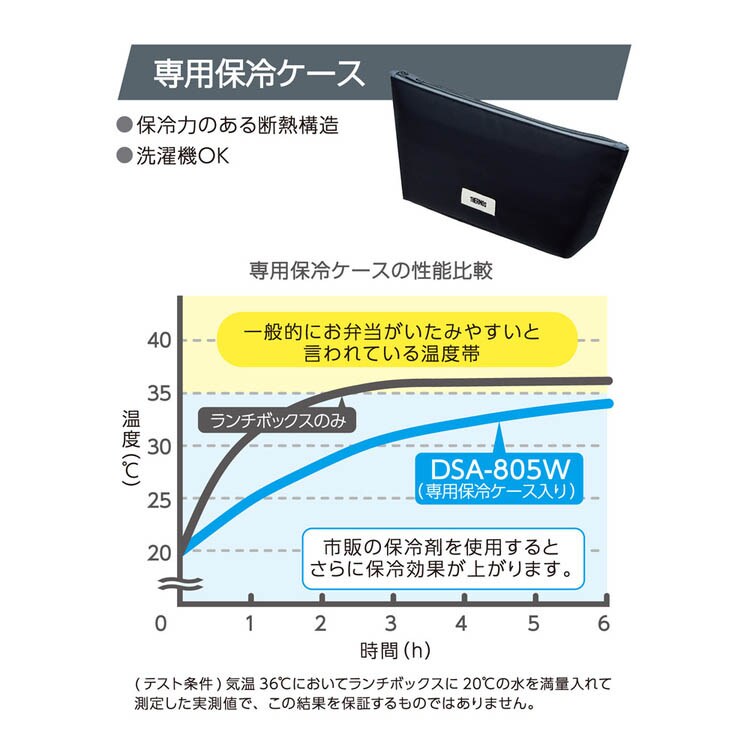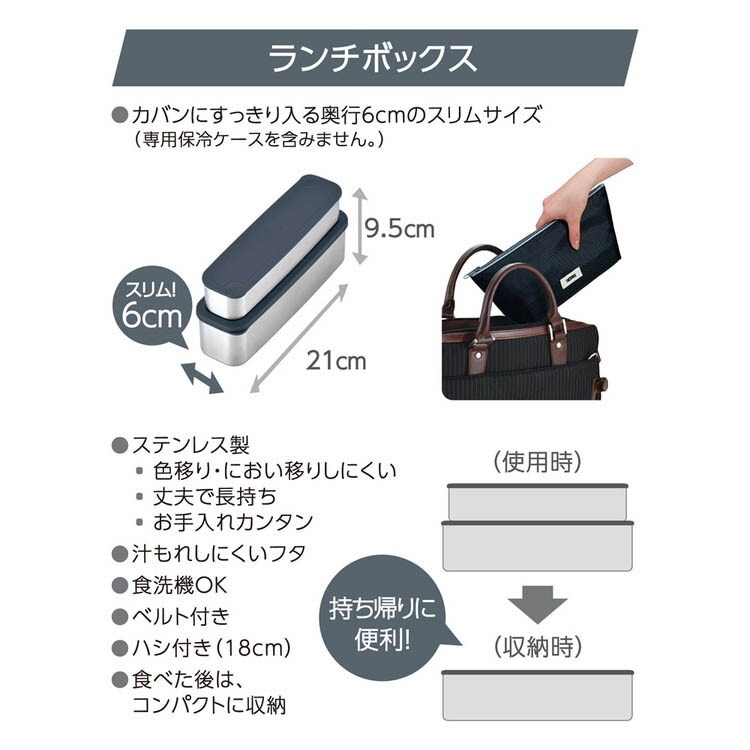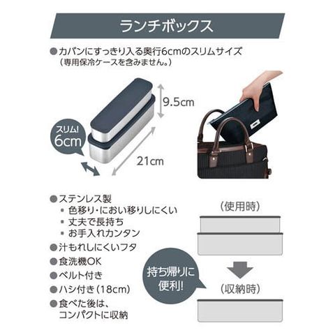 | 本体寸法:約幅21.0×奥行6.0×高さ9.5cm(専用保冷ケースを含みません。) 本体重量:約0.4kg(専用保冷ケースを含みます。) 容量:815ml(上容器:300ml、下容器:515ml) 材質:上容器本体・下容器本体:ステンレス鋼 / 上フタ・下フタ:ポリプロピレン / 上フタパッキン・下フタパッキン:シリコーンゴム /(専用保冷ケース)外生地・内生地:ポリエステル / クッション(断熱材):発泡ポリエチレン |