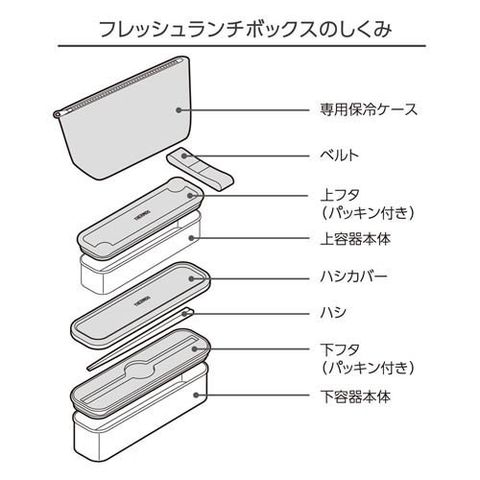 | 上容器本体・上フタ(パッキン付)・下容器本体・下フタ(パッキン付)・ハシ・ハシカバー・ベルト・専用保冷ケース |