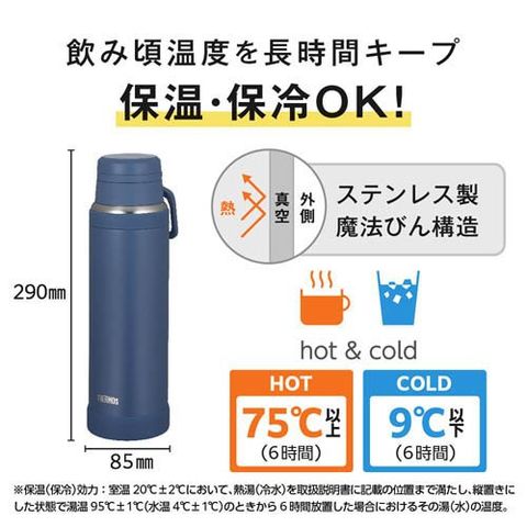 | 本体寸法:約幅85×奥行100×高さ290mm 本体重量:約0.4kg 容量:1.0L 口径:44mm 保温効力:75度以上(6時間) 保冷効力:9度以下(6時間) 材質:内びん:ステンレス鋼 / 胴部:ステンレス鋼(アクリル樹脂塗装) / フタ・ループ・せん本体:ポリプロピレン / フタパッキン・せんパッキン・ボディリング・ソコカバー:シリコーンゴム |
