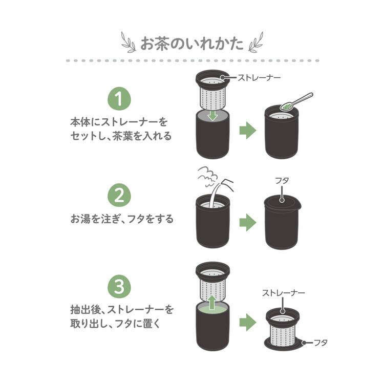 (1)本体にストレーナーをセットし、茶葉を入れる