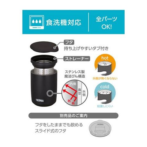 | 本体寸法:約幅95×奥行85×高さ115mm 本体重量:約0.2kg 容量:0.4L(ストレーナー使用時:0.36L) 口径:75mm 保温効力:70度以上(1時間) 保冷効力:7度以下(1時間) 材質:本体:ステンレス鋼(アクリル樹脂塗装)/ フタ:ポリプロピレン / ストレーナー:ステンレス鋼・ポリプロピレン |
