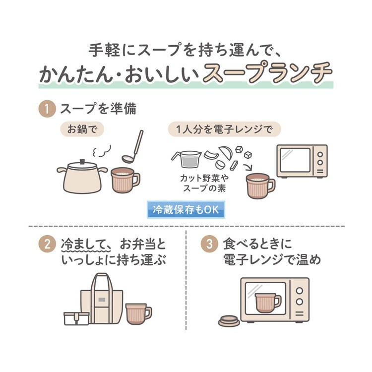 ●手軽にスープを持ち運んで、かんたん・おいしいスープランチが楽しめます。