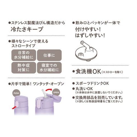 | 本体寸法:約幅65×奥行75×高さ220mm 本体重量:約0.2kg 容量:0.51L 口径:40mm 保冷効力:10度以下(6時間) 材質:内びん:ステンレス鋼 / 胴部:ステンレス鋼(アクリル樹脂塗装)/ フタ・キャップ本体:ポリプロピレン / 飲み口:シリコーンゴム / ストロー:ポリエチレン |