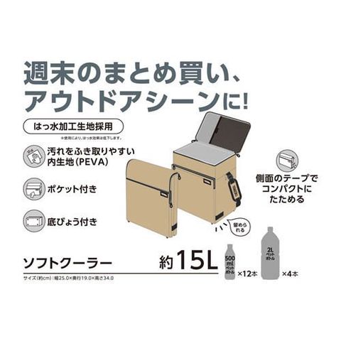 | 本体寸法:約幅250×奥行190×高さ340mm 本体重量:約0.4kg 容量:15L 材質:外生地:ポリエステル(はっ水) / 内生地:PEVA / クッション(断熱材):ポリウレタン・発泡ポリエチレン・ポリプロピレン不織布 |