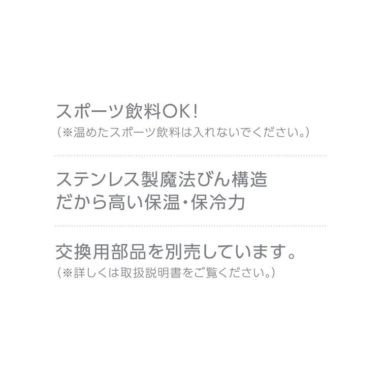 | 本体寸法:約幅7.5×奥行8.0×高さ20.5cm 重量:約0.2kg 容量:0.55L 口径:約4.0cm 保温効力(6時間):69度以上 保冷効力(6時間):10度以下 ★材質 内びん:ステンレス鋼 / 胴部:ステンレス鋼(ポリエステル樹脂塗装)/ フタ・せん本体・飲み口:ポリプロピレン / フタパッキン・せんパッキン:シリコーンゴム ※食洗機対応モデルです。 |