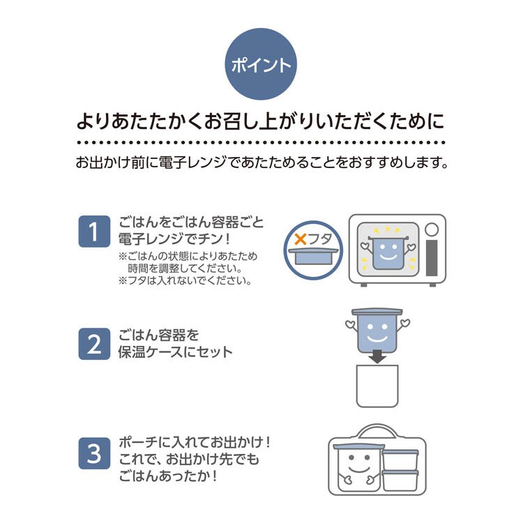 | 本体寸法:約幅19.5×奥行9.5×高さ10.5cm ※専用ポーチを含みません。 重量:約0.4kg ※専用ポーチを含みます。 おかず容器実用量:0.19L×2個 ごはん容器実容量:0.25L×1個、保温米飯容量(炊く前のお米の量):0.10L 保温効力(6時間)/保温ケースのみの場合:50度以上 保温効力(6時間)/保温ケースを専用ポーチに入れた場合:53度以上 ★材質 ・保温ケース:ステンレス鋼(アクリル樹脂塗装) ・ごはん容器:本体:ポリプロピレン/フタ:ポリプロピレン(発泡ポリプロピレン内蔵) ・おかず容器:本体:ポリプロピレン/フタ:シリコーンゴム ・ハシ:飽和ポリエステル樹脂 ・ハシケース:ABS樹脂 ・ポーチ:外生地・内生地:ポリエステル/クッション(断熱材):発泡ポリエチレン ※食洗機対応モデルです。 |