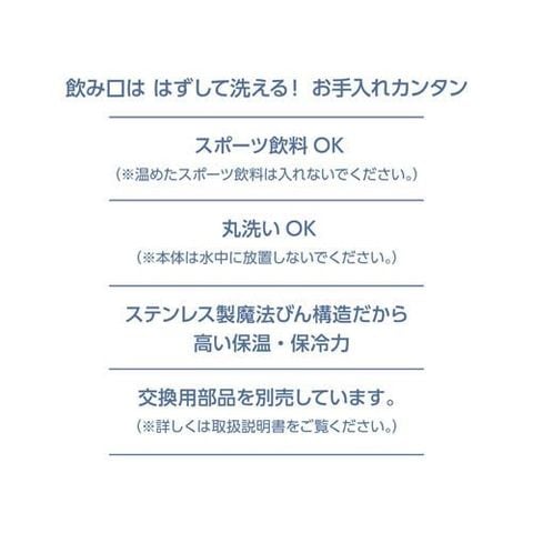 | 本体寸法:約幅6.5×奥行7.5×高さ18.5cm 重量:約0.18kg 容量:0.4L 口径:約4.0cm 保温効力(6時間):65度以上 保冷効力(6時間):11度以下 ★材質 内びん:ステンレス鋼 / 胴部:ステンレス鋼(アクリル樹脂塗装)/ フタ・せん本体・飲み口:ポリプロピレン / フタパッキン・せんパッキン:シリコーンゴム |