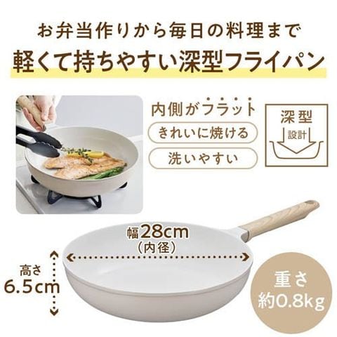 | 本体寸法:約幅48.5×奥行28.5×高さ8.5cm(胴部高さ:6.5cm) 重量:約0.8kg 内径:約28cm 対応熱源:IH・ガス火 ふっ素化合物(PFOA/PFOS)不使用 ★材質 「表面加工」内面:セラミック塗膜加工 / 外面:(底面を除く)焼付け塗装 「材料の種類」本体:アルミニウム合金 / はり底:ステンレス鋼(クロム13%)/ 取っ手:フェノール樹脂 |