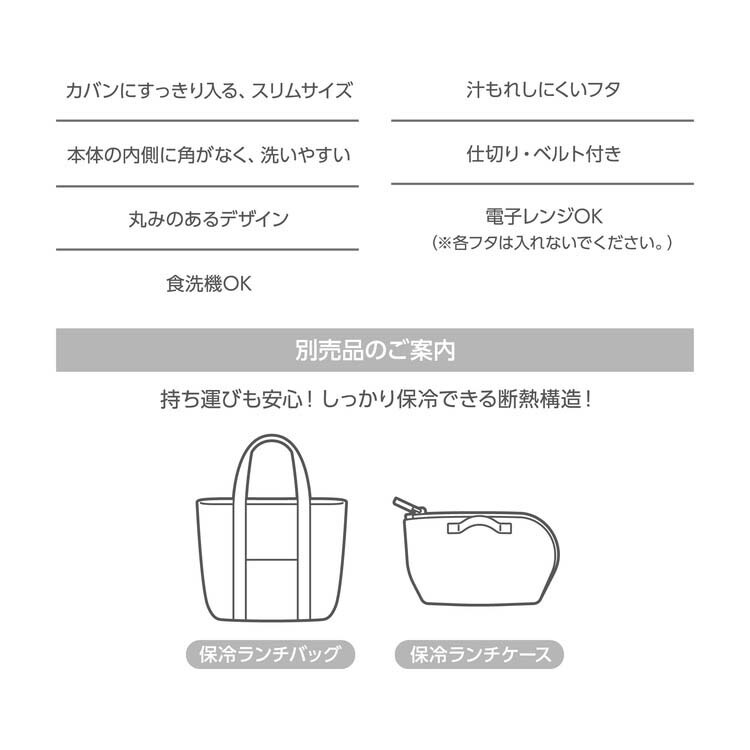 | 本体サイズ(約):幅16×奥行6.5×高さ9.5cm 本体重量(約):300g 容量:600ml 素材・材質:ポリプロピレン/本体:飽和ポリエステル樹脂/仕切り:ポリプロピレン/パッキン:シリコーンゴム 食洗機対応:使用可 |