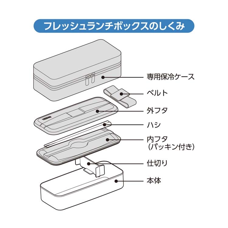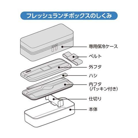 | 本体・内フタ(パッキン付き)・外フタ・仕切り・ベルト・専用保冷ケース・ハシ |
