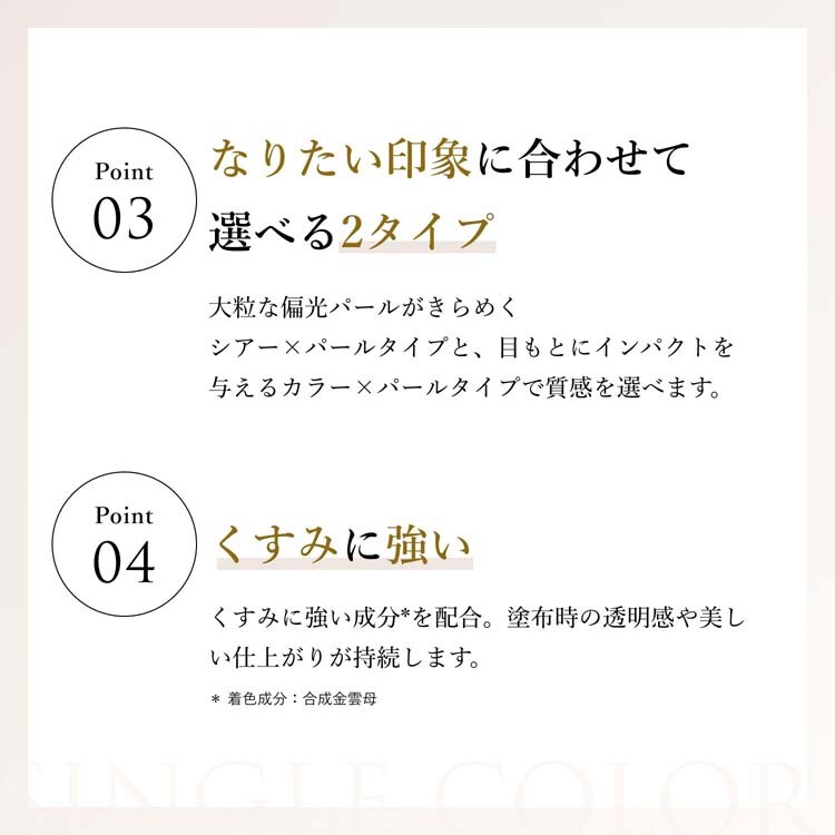 ●選べる2タイプ大粒な偏光パールがきらめくシアータイプと、ベースカラーが映えて目もとにインパクトを与えるカラー×パールタイプの2タイプ。なりたい印象に合わせて質感をお選びいただける単色シャドウです。