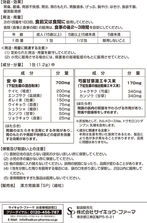 | (1包(1.2g)中) 安中散(下記生薬の混合粉末):700mg (ケイヒ200mg、エンゴサク150mg、ボレイ末150mg、ウイキョウ75mg、シュクシャ50mg、カンゾウ50mg、リョウキョウ25mg) 芍薬甘草湯エキス末(下記生薬の抽出乾燥エキス末):170mg (シャクヤク340mg、カンゾウ340mg) 添加物として、カルメロースNa、トウモロコシデンプン、乳糖を含有します。 |
