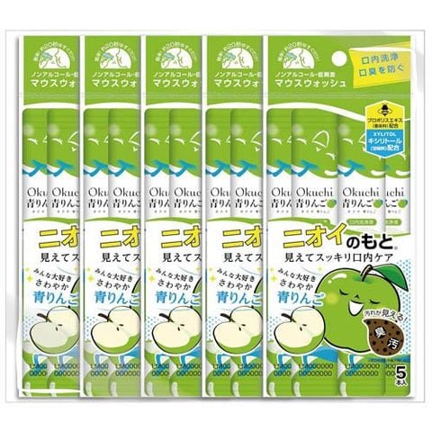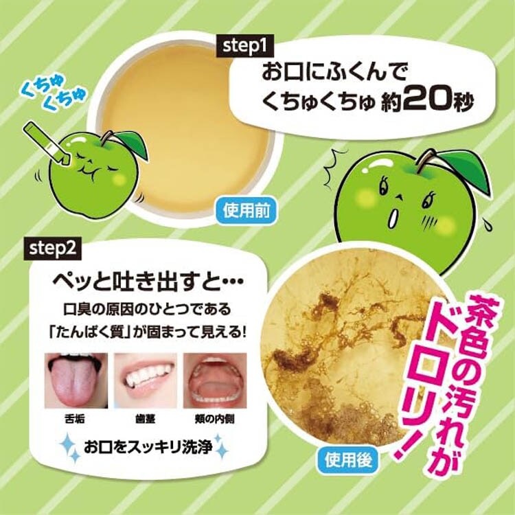●「オクチ青りんご」は、お口の中の汚れ、磨き残しを除去し、口臭の原因の一つであるタンパク質を固めて洗い流す口内洗浄液です。