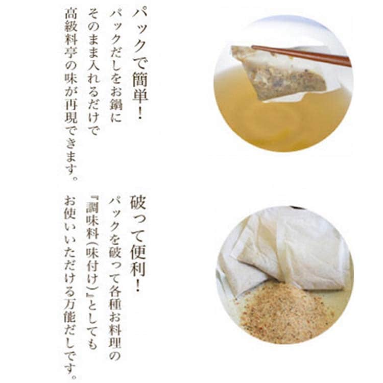 煮物・お鍋・おでん・お吸物などにパックごと入れるだけでしっかりとしたおだしの旨味が出ますので、炊き込みご飯などにもぴったり!