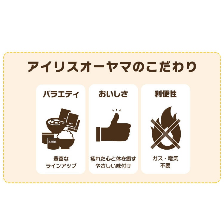 | ★アルファ化米飯(白米)内容量:約100g(出来上り容量約260g)×3 ★アルファ化米飯(五目御飯)内容量:約100g(出来上り容量約260g)×3 ★アルファ化米飯(わかめ御飯)内容量:約100g(出来上り容量約260g)×2 ★米飯類(おかゆ)内容量:約100g(出来上り容量約260g)×6 |