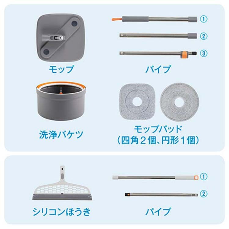 | モップヘッド、モップ専用パイプ、洗浄バケツ、モップパッド(四角パッド2枚、円型1枚)、シリコンほうき |