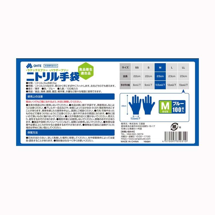 【三国堂 ニトリル手袋 薄手 粉なし 食品衛生法適合 Mサイズ ブルーの商品詳細】
