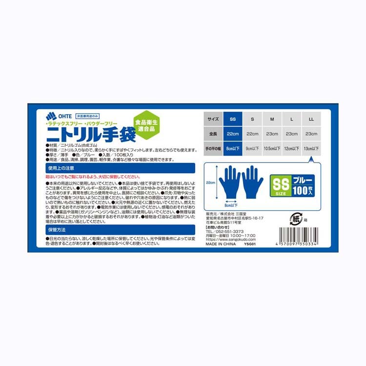 三国堂 ニトリル手袋 薄手 粉なし 食品衛生法適合 SSサイズ ブルー (100枚×20箱入)