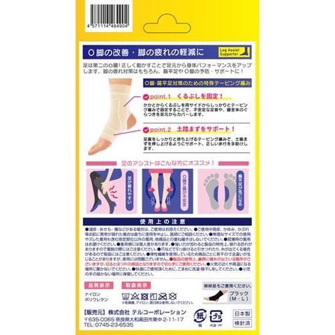 ●かかとからくるぶしを両サイドからしっかりとテーピング編みで固定することで、不安定な足首や足全体のぐらつきを足元からカバーします。
