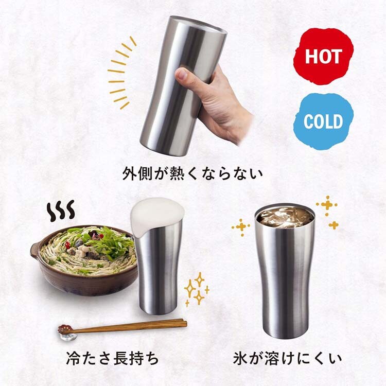 ●真空断熱二重構造で美味しい温度が長持ち。氷が溶けにくく、結露しにくい。