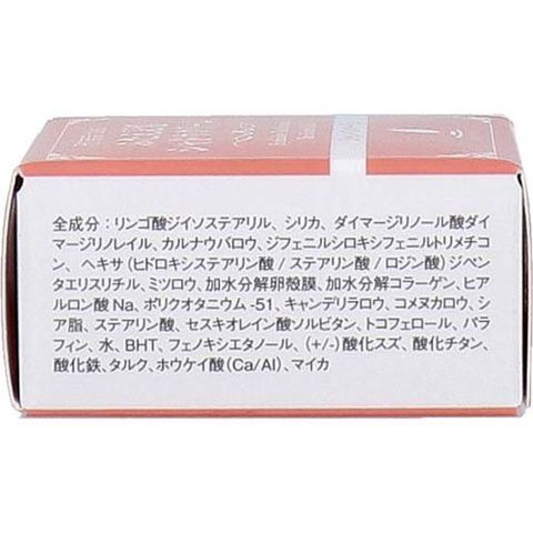 | リンゴ酸ジイソステアリル、シリカ、ダイマージリノール酸ダイマージリノレイル、カルナウバロウ、ジフェニルシロキシフェニルトリメチコン、ヘキサ(ヒドロキシステアリン酸/ステアリン酸/ロジン酸)ジペンタエリスリチル、ミツロウ、加水分解卵殻膜、加水分解コラーゲン、ヒアルロン酸Na、ポリクオタニウム-51、キャンデリラロウ、コメヌカロウ、シア脂、ステアリン酸、セスキオレイン酸ソルビタン、トコフェロール、パラフィン、水、BHT、フェノキシエタノール、(+/-)酸化スズ、酸化チタン、酸化鉄、タルク、ホウケイ酸(Ca/Al)、マイカ |