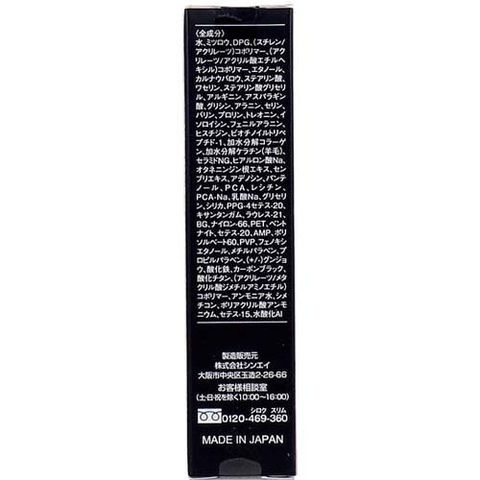 | 水、ミツロウ、DPG、(スチレン/アクリレーツ)コポリマー、(アクリレーツ/アクリル酸エチルへキシル)コポリマー、エタノール、カルナウバロウ、ステアリン酸、ワセリン、ステアリン酸グリセリル、アルギニン、アスパラギン酸、グリシン、アラニン、セリン、バリン、プロリン、トレオニン、イソロイシン、フェニルアラニン、ヒスチジン、ビオチノイルトリペプチド-1、加水分解コラーゲン、加水分解ケラチン(羊毛)、セラミドNG、ヒアルロン酸Na、オタネニンジン根エキス、センブリエキス、アデノシン、パンテノール、PCA、レシチン、PCA-Na、乳酸Na、グリセリン、シリカ、PPG-4セテス-20、キサンタンガム、ラウレス-21、BG、ナイロン-66、 PET、 ベントナイト、セテス-20、AMP、ポリソルベート60、PVP、フェノキシエタノール、メチルパラベン、プロピルパラベン、(+/-)グンジョウ、酸化鉄、カーボンブラック、酸化チタン、(アクリレーツ/メタクリル酸ジメチルアミノエチル)コポリマー、アンモニア水、シメチコン、ポリアクリル酸アンモニウム、セテス-15、水酸化AI |