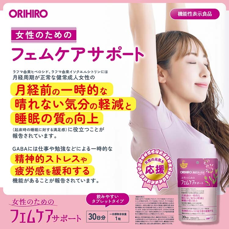 届出表示:本品にはラフマ由来ヒペロシド、ラフマ由来イソクエルシトリンが含まれます。ラフマ由来ヒペロシド、ラフマ由来イソクエルシトリンには月経周期が正常な健常成人女性の月経前の一時的な晴れない気分の軽減と睡眠の質(起床時の睡眠に対する満足感)の向上に役立つことが報告されています。本品にはGABAが含まれます。GABAには仕事や勉強などによる一時的な精神的ストレスや疲労感を緩和する機能があることが報告されています。
