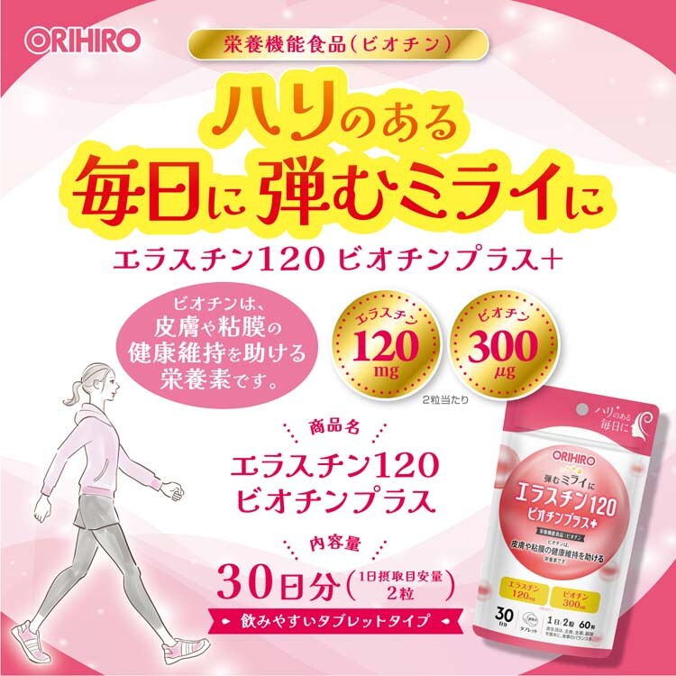●本品は美容に役立つ成分としてエラスチンを配合しています。そのエラスチンをたっぷり120mg配合、エラスチンの良さを実感しやすい製品となっています。