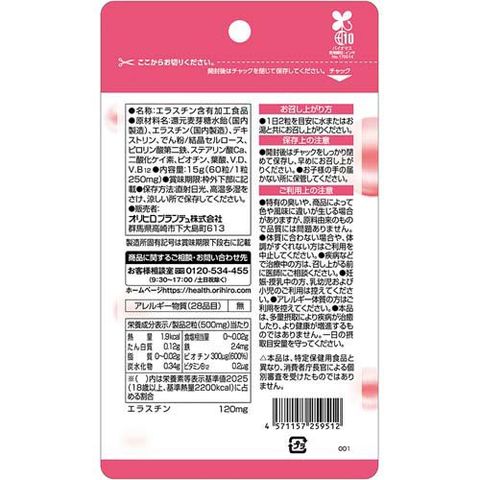 | 還元麦芽糖水飴(国内製造)、エラスチン、デキストリン、でん粉/結晶セルロース、ピロリン酸第二鉄、ステアリン酸Ca、二酸化ケイ素、ビオチン、葉酸、V.D、V.B12 |