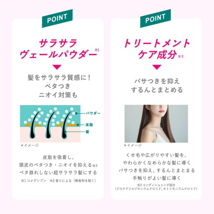 ●スタイリング前に髪の根元や髪全体にスプレーしてブラッシングすれば、サラサラヴェールパウダー※が髪をサラサラにコーティング。