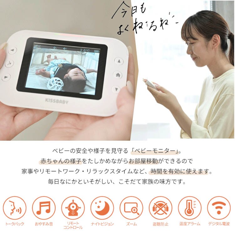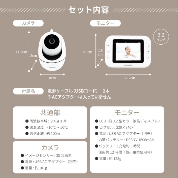 | サイズ・カメラ/高さ11.5X幅8X奥行8cm、モニター/高さ8.5X幅12.2X奥行1.9cm(3.2インチ) モニター重量・128g 電源:USB ACアダプター(別売)・重量:約181g、モニター/LCD:約3.2型カラー液晶ディスプレイ・ピクセル:320X240P 電源:USB ACアダプター(別売)・内臓バッテリー:DC3.7V 1600mAh・バッテリー:充電約5時間(使用約12時間/最小電力使用時) 重量:約128g 主な素材:ABS樹脂 対象年齢:0ヶ月頃~ 生産国:中国 |