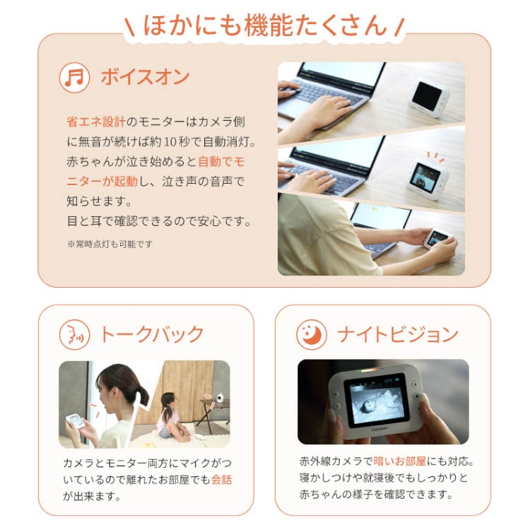 | セット内容・カメラ、モニター、電源ケーブル(USBコード)2本 ※ACアダプターは入っていません セット詳細・共通部/周波数帯域…2.4GHz帯・適温温度…-10~50度・通信距離…約100m、カメラ/イメージセンサー※30万画素 |