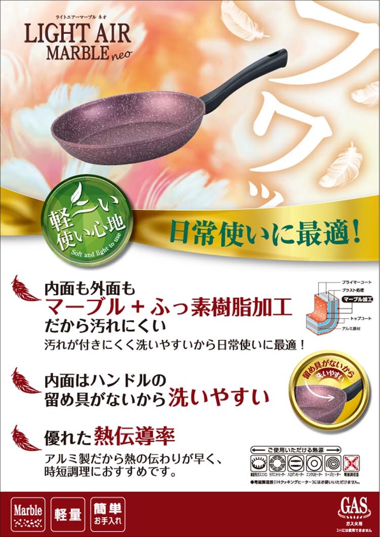 ●内面も外面もマーブル+ふっ素樹脂加工だから汚れが付きにくく、アルミ製で熱の伝わりがいいので日常使いに適しています。