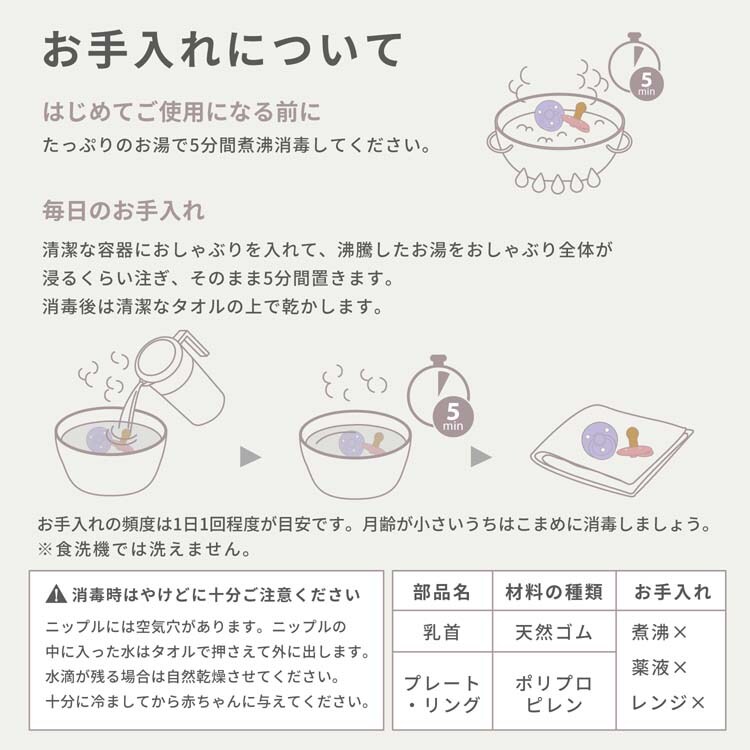 | サイズ:1(0~6か月) おしゃぶり:縦4.9cm×横4.5cm×厚さ4.0cm 本体重量:6g 素材:ニップル:天然ゴム プレート・リング:ポリプロピレン キャップ:縦3.8cm×横4.9cm×厚さ4.9cm 本体重量:7g 素材:低密度ポリエチレン |