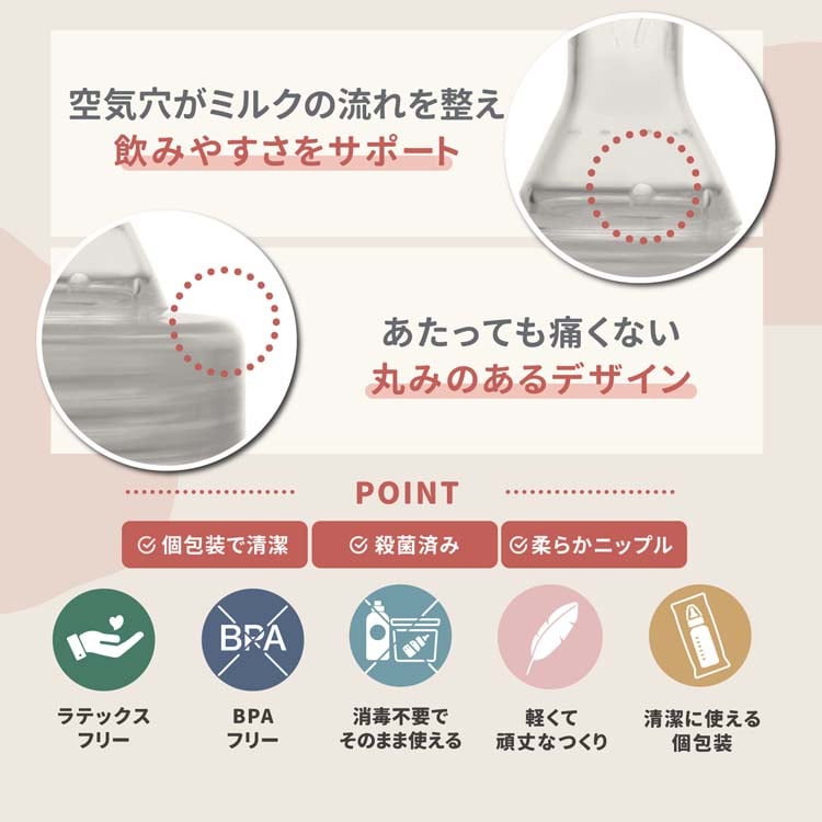 ●柔らかいシリコンニップル。空気穴付きでスムーズに飲める。