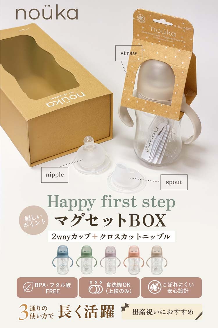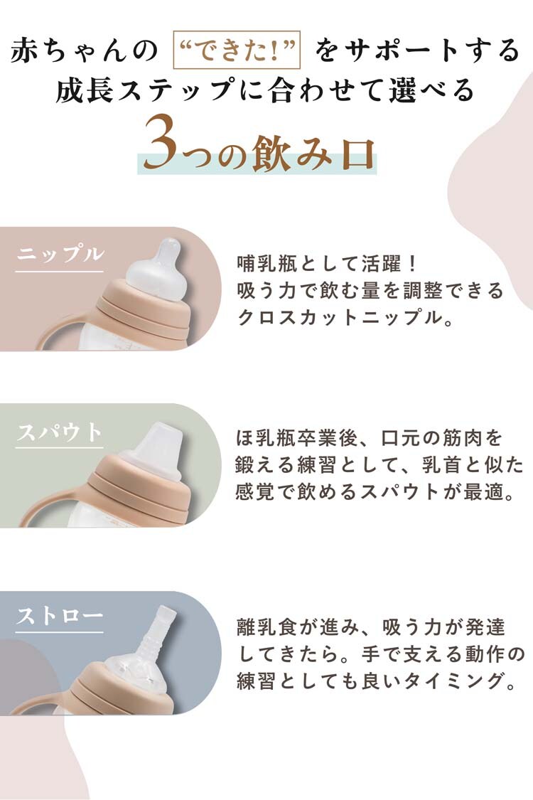 ●3通りの使い方:スパウト、ストロー、ニップル入りで哺乳瓶としても使えるため、乳児期から長くご使用いただけます。
