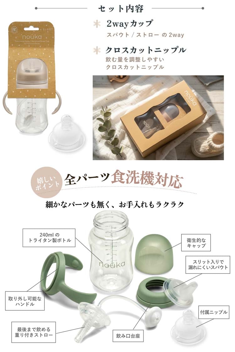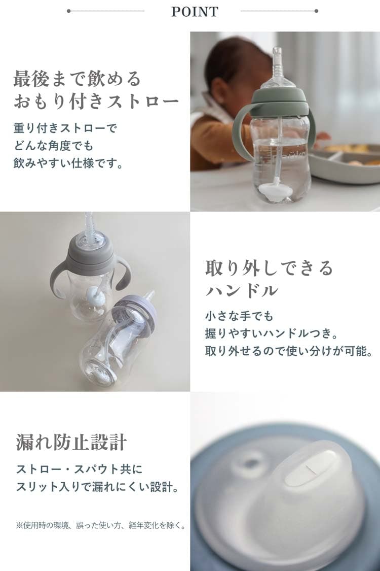 ●3通りの使い方:スパウト、ストロー、ニップル入りで哺乳瓶としても使えるため、乳児期から長くご使用いただけます。