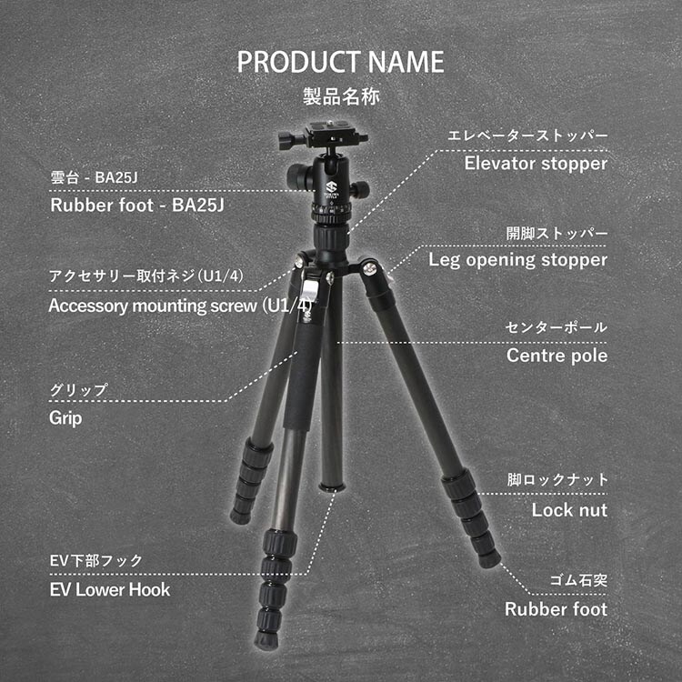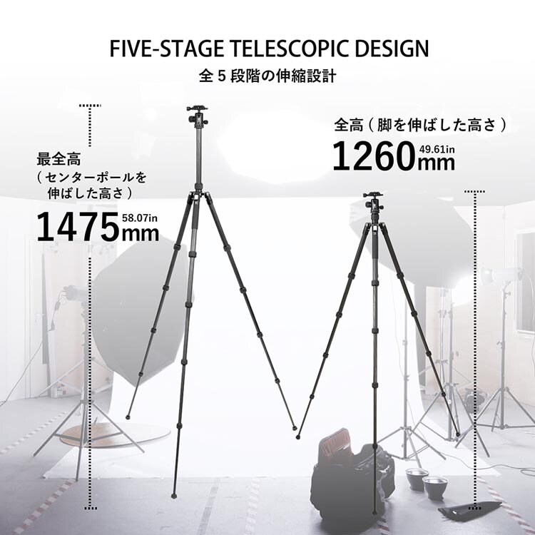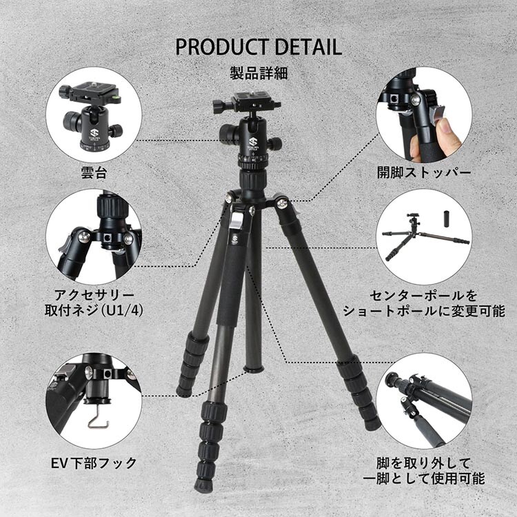 | 素材:カーボン 段数:5 sections パイプ径大:22mm パイプ径小:10mm 最全高:1475mm 全高:1260mm 最低高:210mm 縮長:365mm 重量:1.1kg 脚全高:1260mm 脚縮長:410mm 脚重量:0.47kg 雲台取付ベース径:38mm 耐荷重:5kg |